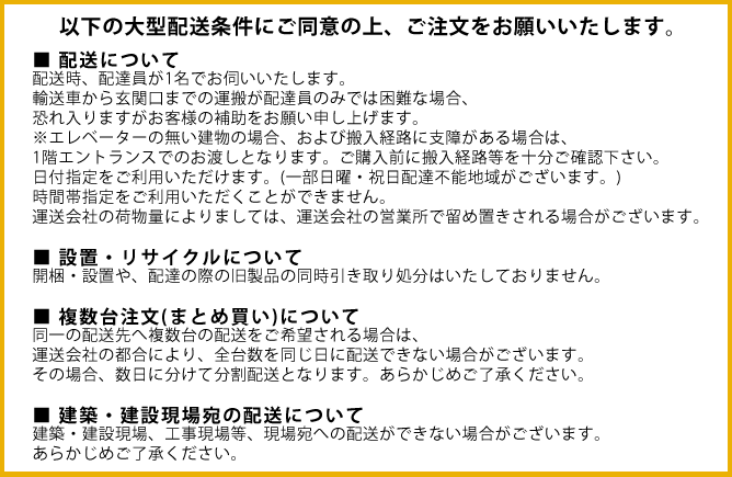 下記条件をご了承いただきましたら、ショッピングカートに商品を入れる際に、『大型配送条件にご了承頂ける場合はチェックを入れて下さい』を選択いただけますようお願いいたします。