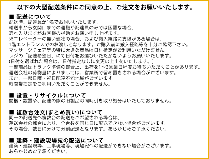 下記条件をご了承いただきましたら、ショッピングカートに商品を入れる際に、『大型配送条件にご了承頂ける場合はチェックを入れて下さい』を選択いただけますようお願いいたします。