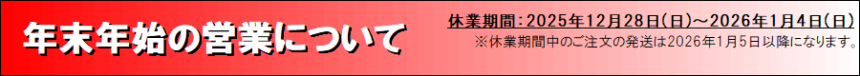 - 年末年始休業案内2025年12月28日(日) ~2026年1月4日(日)は年末年始休業のため、お問合せ対応及び発送業務をお休みさせていただきます。 休み期間中もご注文の受け付けは承っております。