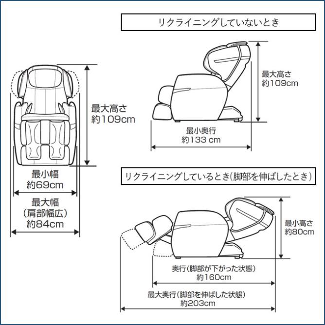 | 重量 | 68 kg | 寸法 | 通常(約):幅69x高さ109x奥行133cm(脚部収納、肩部を閉じた時)|リクライニング時(約):幅84x高さ80x奥行203cm(脚部最大使用、肩部を開いた時) |