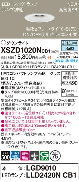 パナソニック LEDダウンライト XSZD1020NCB1 (本体:LGD9010+ランプ:LLD2420NCB1)(調光:ライコン別売)60形中角(昼白色)電気工事必要 Panasonic