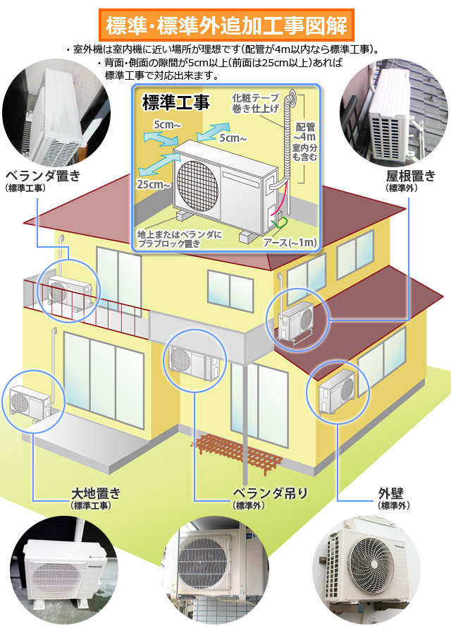 取り付け | 6,600円 | 専用台組立及び固定調整、 本体取付、アース線接続、ドレンホース取付 |